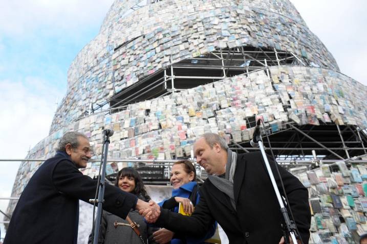 Torre de Babel de Libros, instalada en la Plaza San